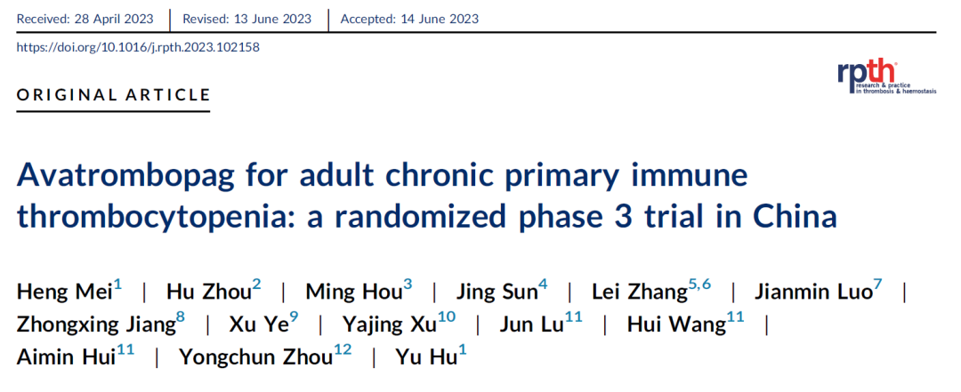 1. 1.     Heng Mei, et al. Avatrombopag for adult chronic primary immune thrombocytopenia: a randomized phase 3 trial in China. Res Pract Thromb Haemost. 2023;7:e102158.